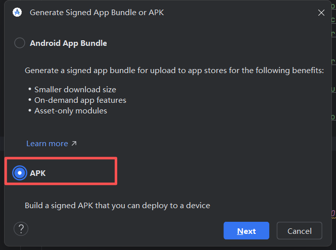 - APK:这是通用的安装包格式,可以直接安装。 建议:为了演示方便,这里我们先选择 APK,点击 Next。